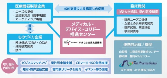 山梨県では、機械電子産業のものづくり技術や立地特性を活かし、甲府盆地から静岡県東部までを回廊のようにつないで、医療機器関連産業の一大集積地に成長させるメディカル・デバイス・コリドー構想の実現を目指しています。